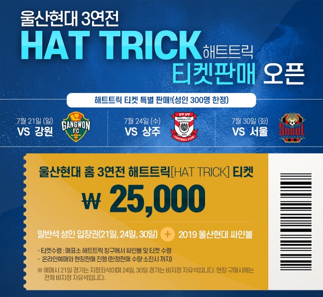 해트트릭 티켓은 7월 21일(일) 강원FC전, 24일(수) 상주상무전, 30일 FC서울전까지 세 경기를 관람하고 사인볼까지증정받는 패키지이다.