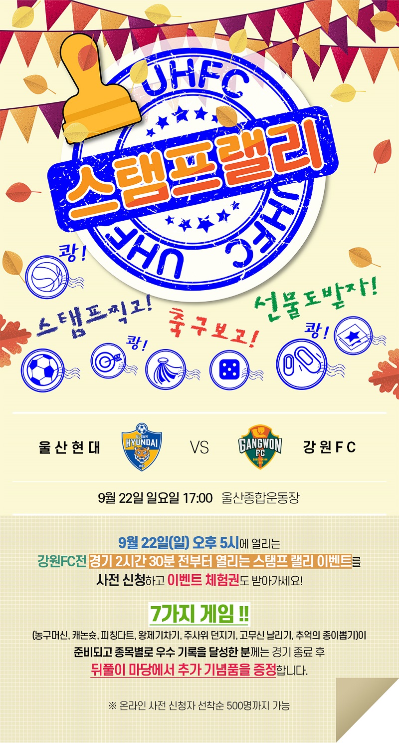 경기 당일 다양한 이벤트를 진행해온 울산현대는 22일(일) 오후 5시 울산종합운동장에서 열리는 강원FC전에서 ‘스탬프 랠리’를 진행한다.