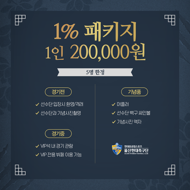 울산현대의 1% 패키지 구매자는 경기 전 선수단 입장시 격려와 사진 촬영에 동참하며, 경기 중에는 VIP석 에서 경기를 관람하고 VIP실 내의 음식과 음료를 이용할 수 있다. 또한, 머플러와 선수단 백구 친필 사인볼이 기념품으로 증정된다. 당일 촬영한 기념사진은 액자와 함께 특별 제작되어 증정된다. 차량 방문 시, VIP 주차장 이용이 가능하다.