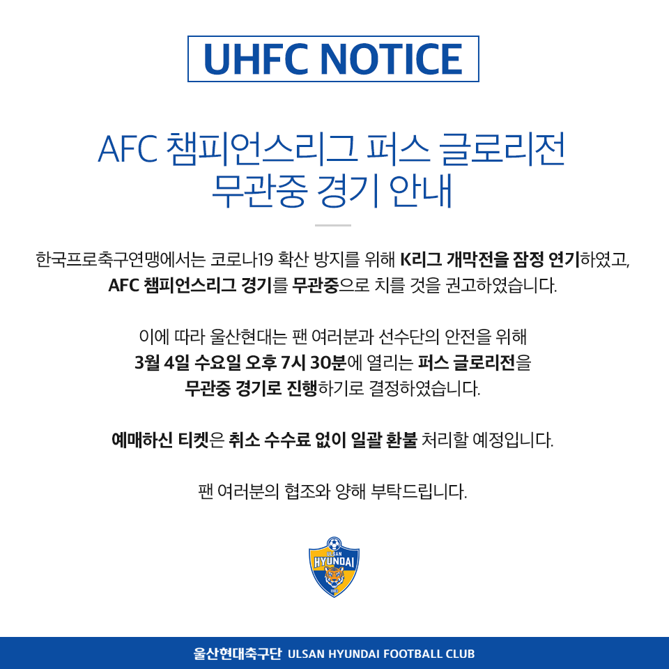 이에 따라 울산현대는 관중들과 선수단의 안전을 위해 약 일주일 앞으로 다가온 퍼스 글로리와 홈경기를 무관중 경기로 치르기로 결정했다.
