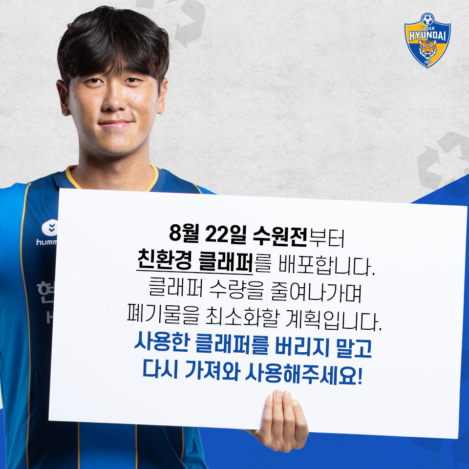 또 경기장 내 UHSHOP에서는 1회용 응원도구를 대신해 사용할 수 있는 응원도구를 판매, 울산의 ‘잘 가세요’ 타임에는 응원봉을 활용하여 선수들에게 힘을 실어 줄 예정이다.