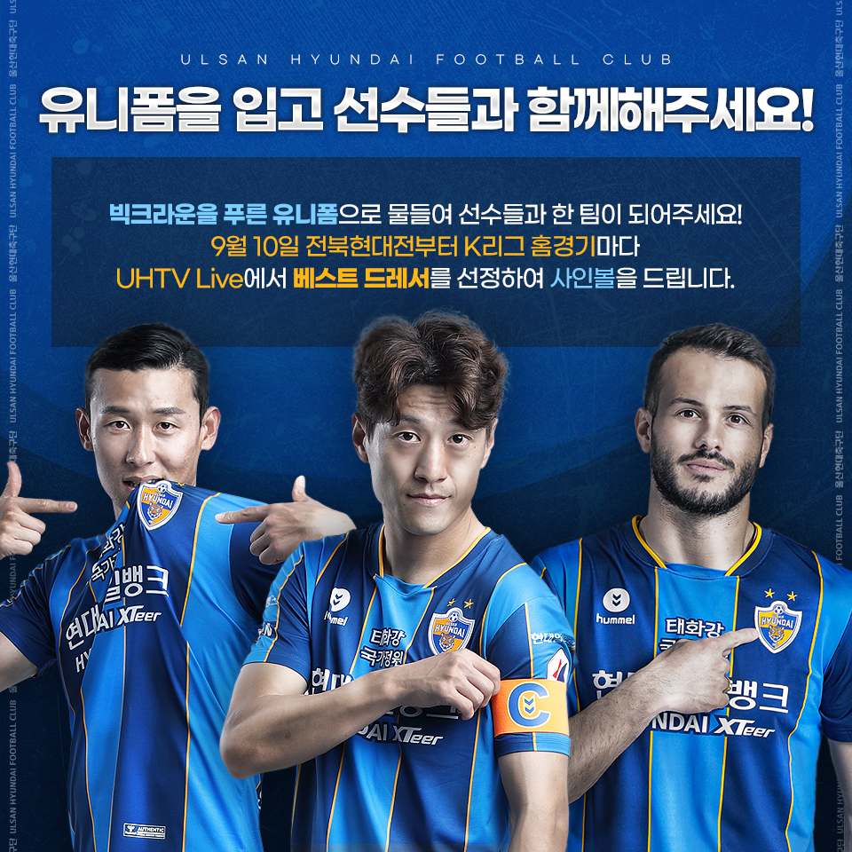 울산은 9월 10일 금요일 전북현대와의 홈경기부터 유니폼 입기 캠페인을 진행하고 경기 전 자체 유튜브 라이브 방송인 ‘UHTV Live’를 통해 베스트 드레서를 선정하여 사인볼을 증정한다. 유니폼 입기 캠페인은 지난 22일부터 시행한 에코 캠페인(친환경 클래퍼, 다회용 응원도구 사용)과 더불어 매 경기 진행될 예정이다.