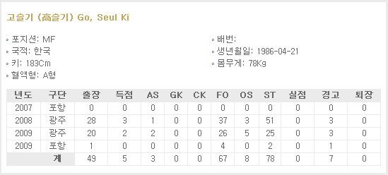 지난 시즌 광주돌풍의 핵심 멤버였던 고슬기는 체력이 좋아 활동량이 많고 성실하기로 소문이나 있는 선수다. 특히 발목의 힘이 좋아 슈팅력 역시 우수하다는 평가를 받고 있다.