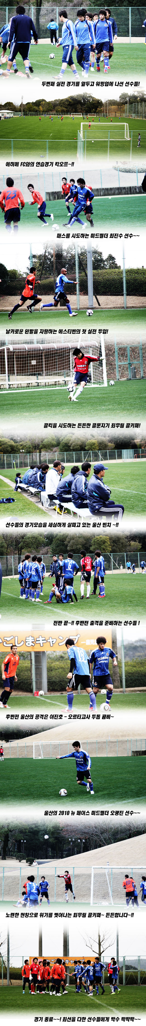 일본 가고시마에서 전지훈련 중인 울산 현대 축구단이 지난 10일 두번째 연습 경기를 치렀습니다.울산은 10일 오후 3시 일본 가고시마 겐코노모리 구장에서 J리그 2부팀인 에히메FC와 연습경기를 갖고 그동안 중점적으로 훈련한 선수단의 체력적인 부분과 전술적인 부분에 대해서 점검했습니다.