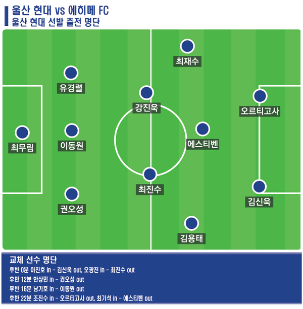 울산 입단 후 첫 실전 무대에 투입 된 에스티벤이 공격형 미드필더로 나섰고, 최전방 투톱은 지난 기타큐슈와의 첫 연습경기와 마찬가지로 오르티고사와 김신욱 콤비가 선발 출장했습니다.
