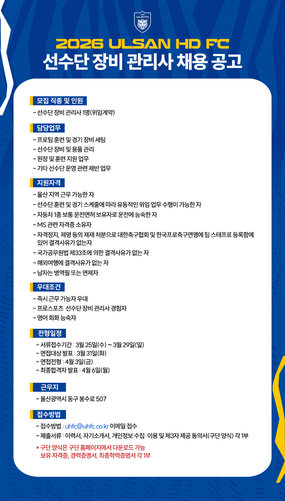 - 제출서류 : 이력서, 자기소개서, 개인정보 수집·이용 제3자 제공동의서(구단 양식) 각 1부